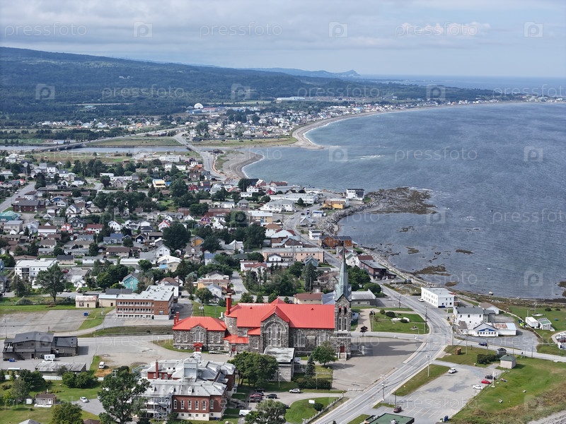Вид с воздуха на католическую церковь Святой Анны недалеко от Сен-Анне де Монтс в Квебеке, где есть дома и горы