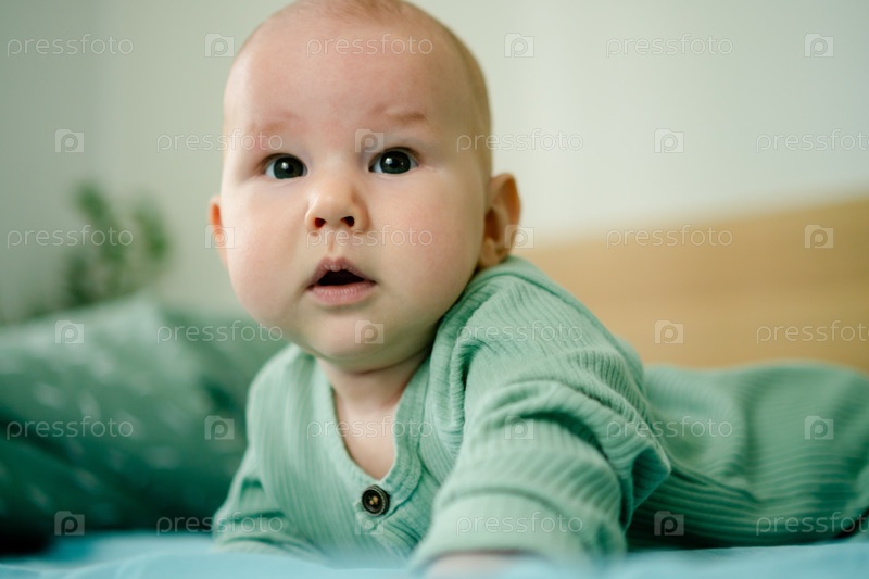 Ребенок в зеленой пижаме исследует окружающую среду, лежа на мягком одеяле, захватывая суть любопытства, роста и ранних стадий развития