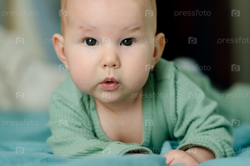 Ребенок в зеленой жилетке с ребрами опирается на мягкое синее одеяло, показывая внимательное выражение лица, которое подчеркивает уютную атмосферу и нежные текстуры спокойного момента