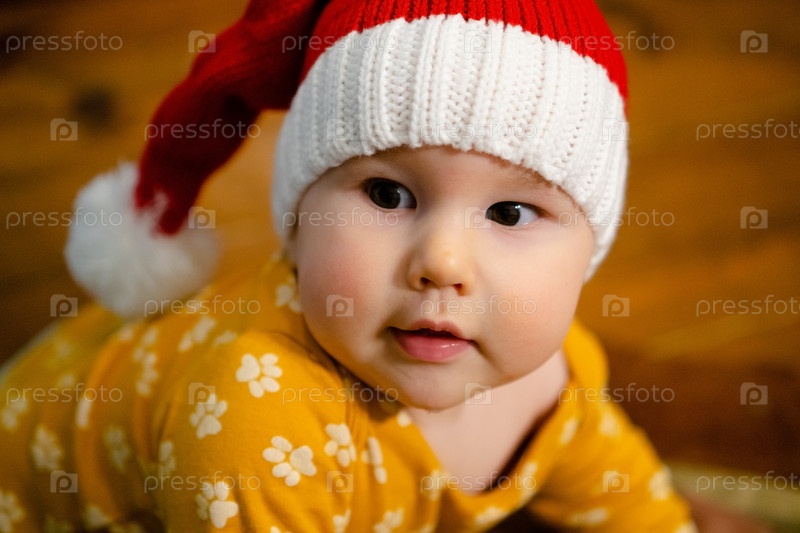 Милый ребенок в праздничной шляпе Санты и ярко-желтом наряде, олицетворяющий радость и магию рождественского сезона. любопытный вид ребенка добавляет обаяния этому трогательному портрету