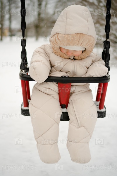 Любопытный ребенок, упакованный в уютную сноуборду, переживает зимние веселья на качелях.Сцена запечатлевает радость ребенка или малыша, исследующего снежные просторы с удивлением и радостью