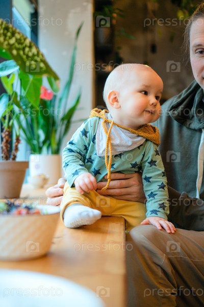 Родитель с ребенком в кафе держит ребенка, когда малыш тянется за едой лосося. Семейная любовь, ценности, забота и связь в общественном ресторане. Современное образование и образ жизни