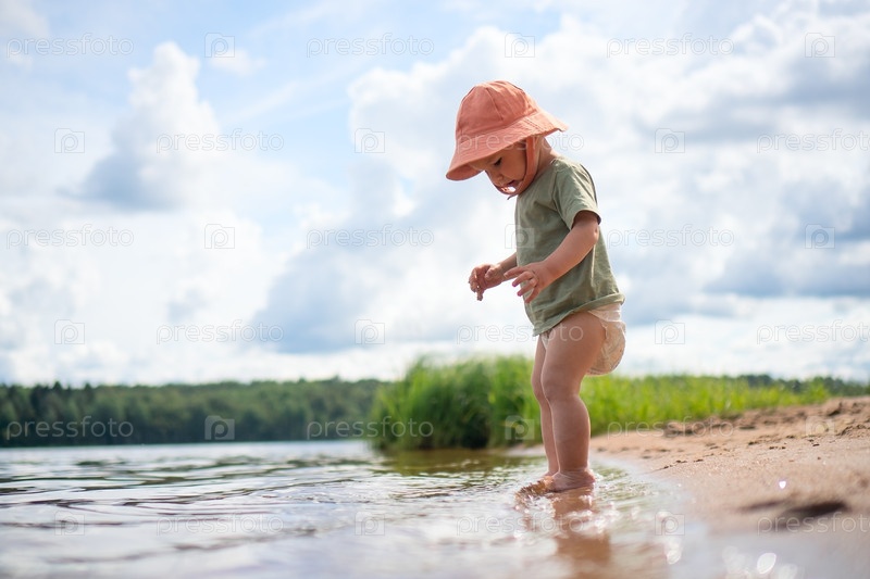 Мальчик играет у воды в оранжевой шляпе, наслаждаясь волнами и атмосферой пляжа