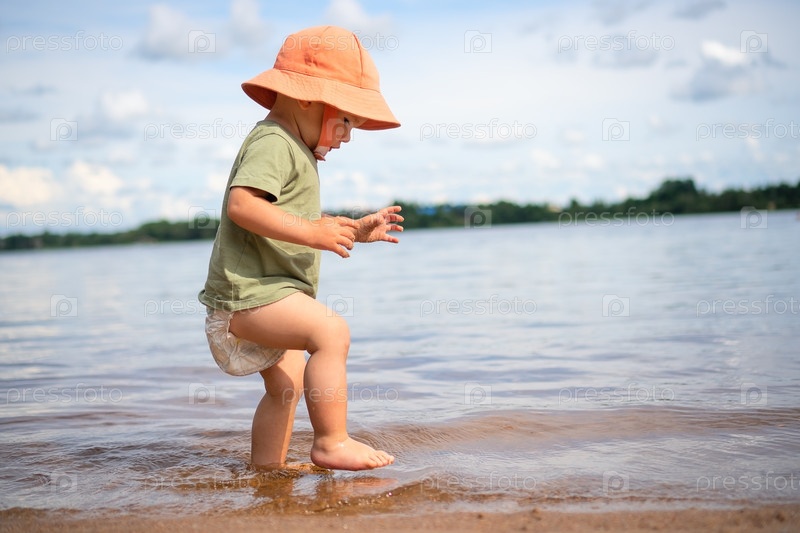 Малыш в оранжевой шляпе ходит по воде, исследуя окружающую природу и наслаждаясь приключениями на свежем воздухе, демонстрируя невиновность и удивление раннего детства