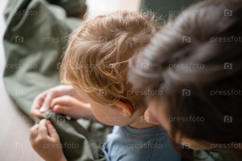 Загруженная мать работает портной дома, собирая швы на своих штанах, в то время как ее ребенок сидит на коленях и помогает