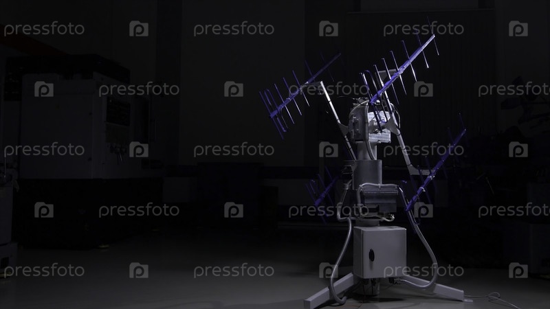Высокотехнологичная сложная электронная связь, радио- или телевизионная антенна. Демонстрация высокотехнологичной антенны, устройства связи. Телекоммуникационный мачта с HD микроволновой коммуникацией