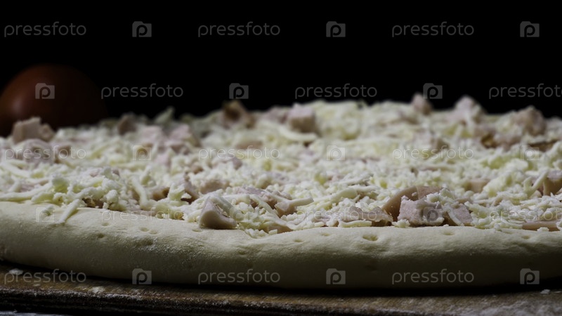 Закройте руки с поваром в прозрачных перчатках относительно невыгоревшей пиццы на черном фоне, кулинарная концепция