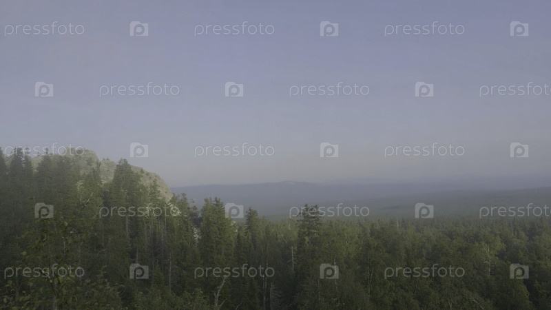 Горные вершины с видом на деревья горного леса.Горная местность и лес в тумане.Прекрасный лес и горы