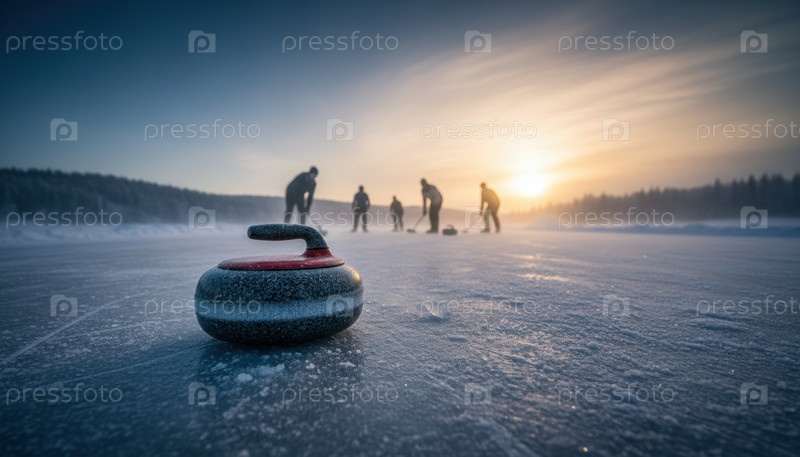 Кёрлинг-стоун на замороженном льду с игроками на расстоянии увлекательная командная работа в зимних видах спорта, стратегическая ориентация и дух конкуренции на открытом воздухе
