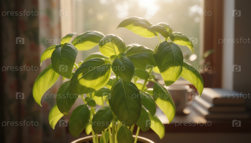 Растение базилика, символизирующее домашнее садоводство, органический образ жизни, кулинарное вдохновение, свежие травы и тенденции устойчивого образа жизни