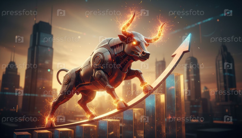 Футуристический роботизированный бык, заряженный вверх, символизирует тенденции финансового роста, оптимизм на фондовом рынке, инновации и растущую экономическую динамику