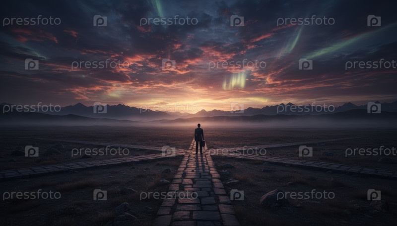 Силуэт в ночное время пересекается под ярким небом, символизируя неопределенность, возможности, личное направление, амбиции и преобразующие жизненные моменты