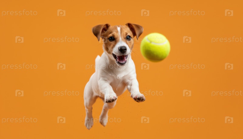 Игровое щенко прыгает на теннисный мяч на ярком фоне, выражая радость, жизнь животных, энергию, веселый тренировочный момент и положительные эмоции