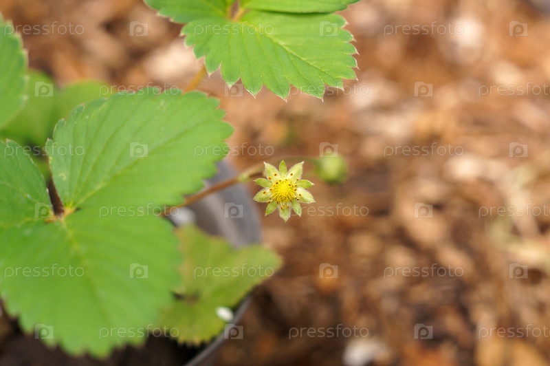 клубничный галстук на зеленом кусте в горшке на фоне мульчи