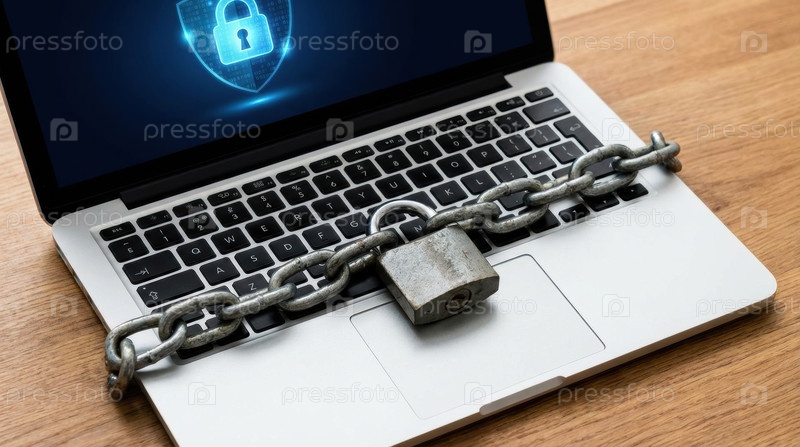 Ноутбук, завернутый в тяжелую цепь и замок, символизирующий защиту данных от угроз кибербезопасности, шифрование цифровой конфиденциальности и защиту конфиденциальной информации