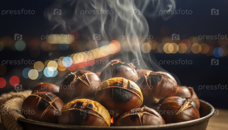 Жареные каштаны, курящие в вечернем свете, вызывают ностальгию по зимнему рынку, напоминают о праздничном тепле, сезонной уличной еде и праздничной городской атмосфере
