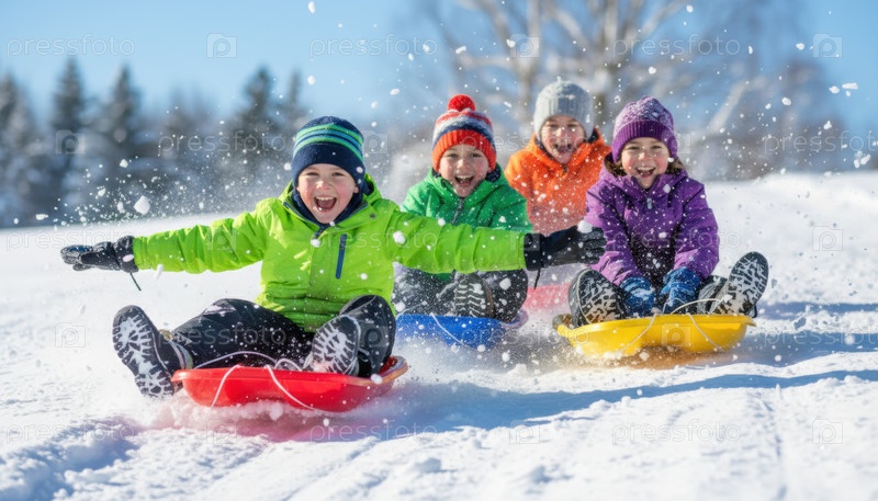 Дети весело сажают санки с заснеженного холма в яркий зимний день, создавая веселые каникулы