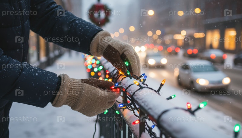 Руки украшают снежные перила огнями, изображающими подготовку зимней улицы к Рождеству и сезонным традициям