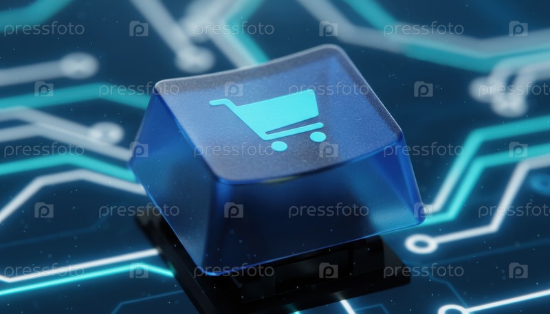 Светящаяся крышка корзины покупок на футуристической печатной плате, символизирующей инновации в цифровой торговле и глобальные тенденции электронной коммерции в современную эпоху технологий