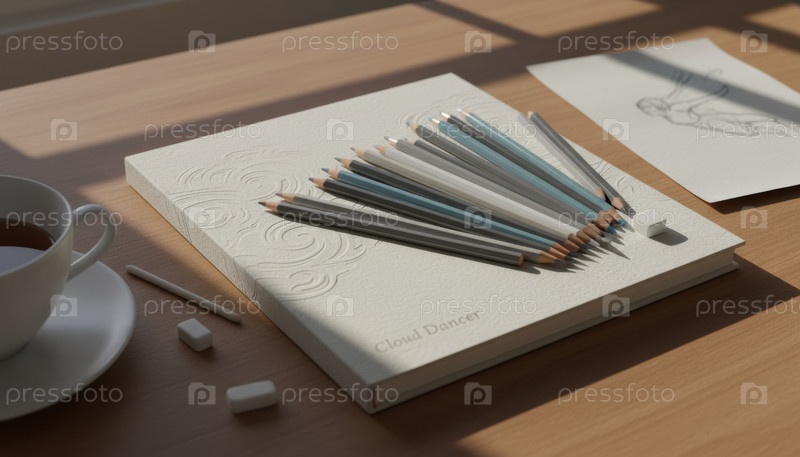 Мягкий теплый белый тон с рельефным узором и расставленными карандашами в бледном спокойном свете, создавая минимально безмятежное художественное рабочее пространство с деликатной изысканной текстурой