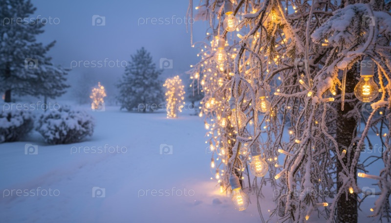 Снежные деревья, покрытые теплыми огнями, создают спокойную зимнюю атмосферу чудес во время рождественского или новогоднего сезона