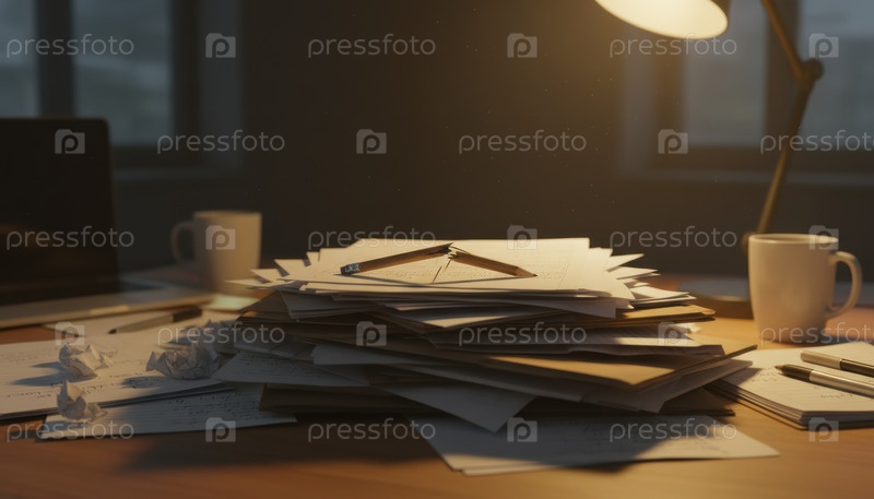 Рабочий стол, переполненный бумагой и сломанным карандашом отражают стресс на работе, крайние сроки, творческий блок и проблемы с производительностью