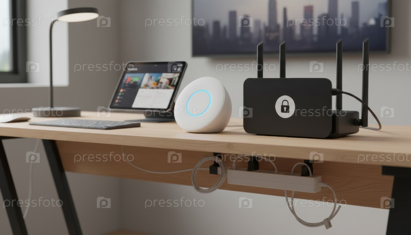 Беспроводный маршрутизатор и устройство безопасности сети на деревянном офисном столе с системой управления кабелями и современным планшетом в домашней рабочей зоне
