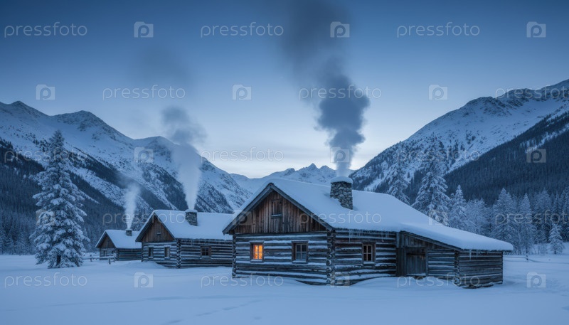 Снежные горные хижины в Альпийском регионе при закате солнца под теплым светом, символизирующие традицию убежищ и зимнего спокойствия
