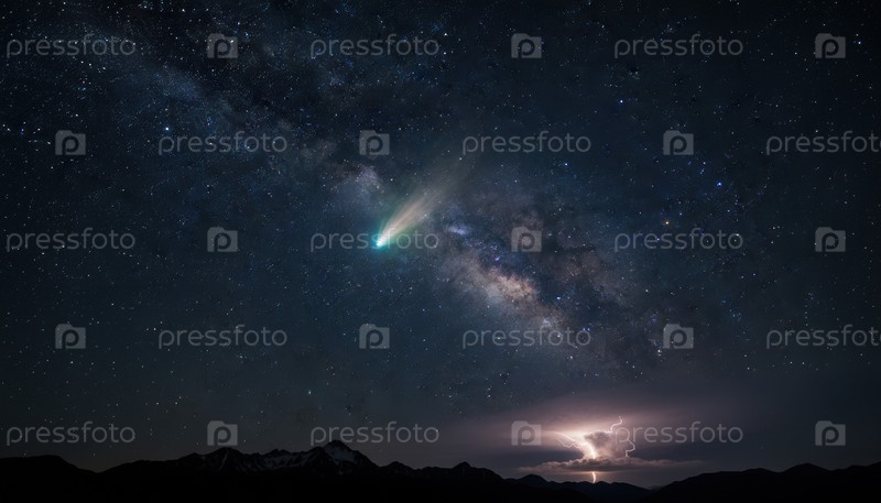 Потрясающий ночной пейзаж, изображающий ярко-зеленую комету и галактику Млечный Путь среди темных гор с далекой молнией