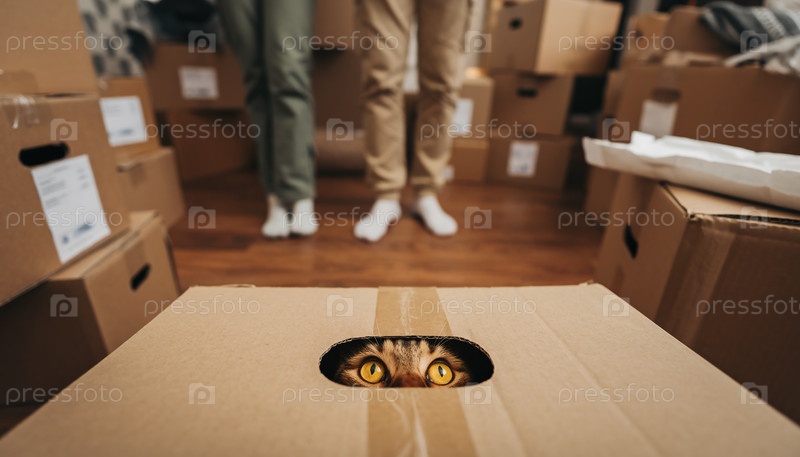 Любопытный кот заглядывает из картонной коробки во время сцены переезда дома, представляющей юмор и адаптацию домашних животных в семейную жизнь