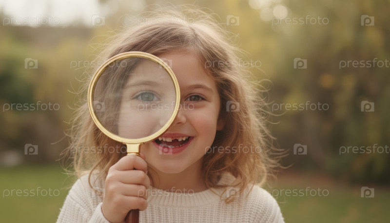 Веселый ребенок, держащий лупу, игриво исследует мир, предлагая открытие любопытства в раннем обучении и творческие образовательные моменты на свежем воздухе