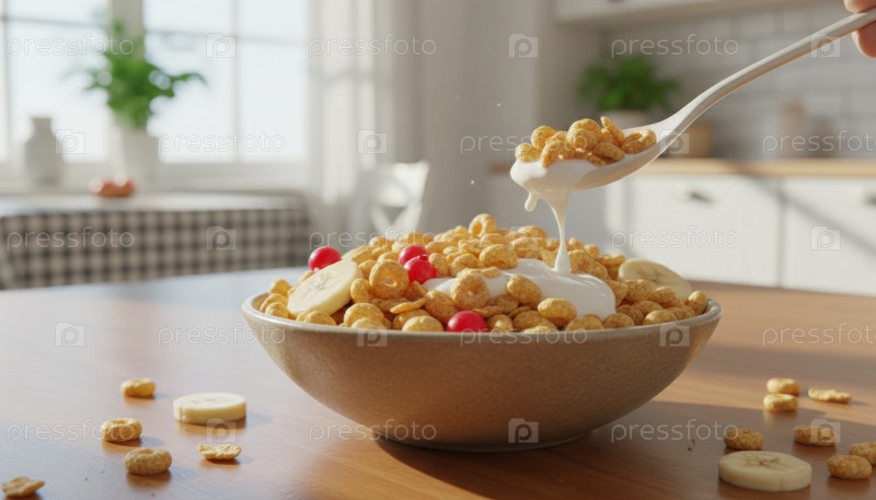 Ложка с порцией добавляет йогурт в вкусную миску для завтрака, нарезы бананов и красные ягоды на кухонном столе деревни