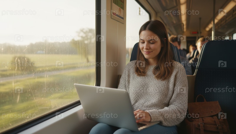 Путешественник работает на ноутбуке в утреннем поезде через европейскую деревню, выражая мобильность и современное путешествие