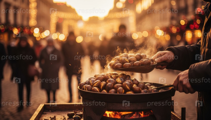 Печеный каштан на праздничном уличном рынке Европы в зимний вечер отдыха