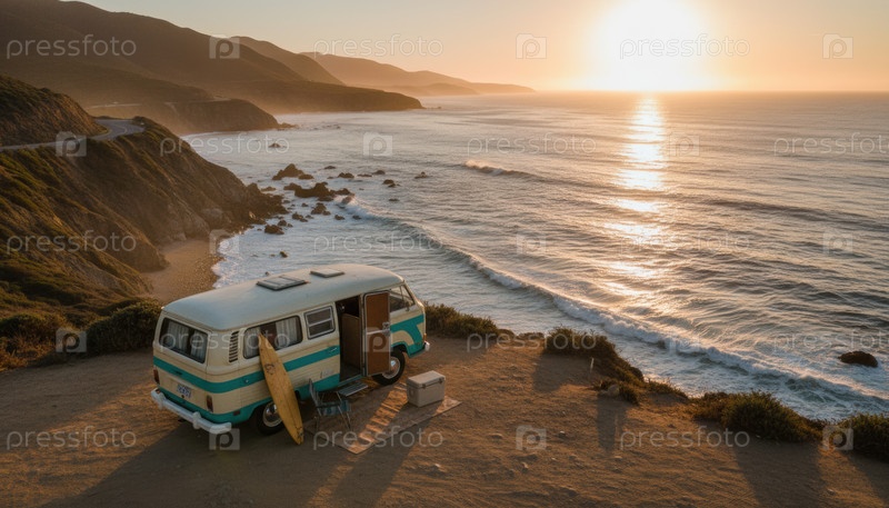 Прибрежная туристическая сцена с винтажным фургоном на закате, символизирующая приключения исследования свободы и растущую тенденцию мобильных побегов
