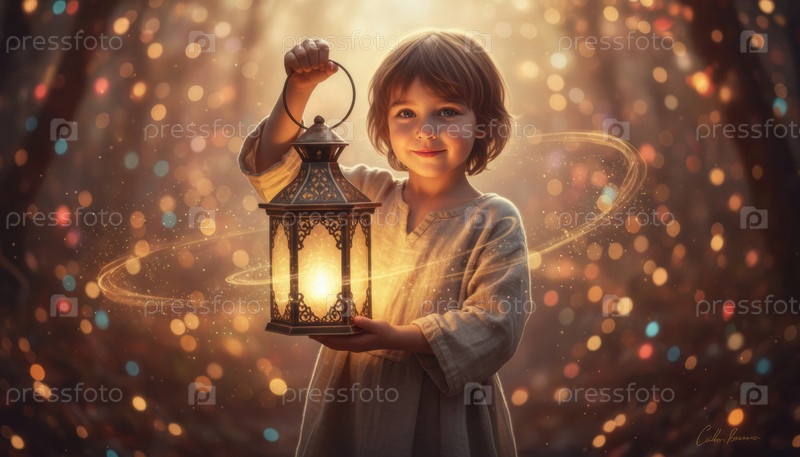 Ребенок держит светящийся фонарь в заколдованном лесу на закате, предлагая удивительную надежду и сезонный пир