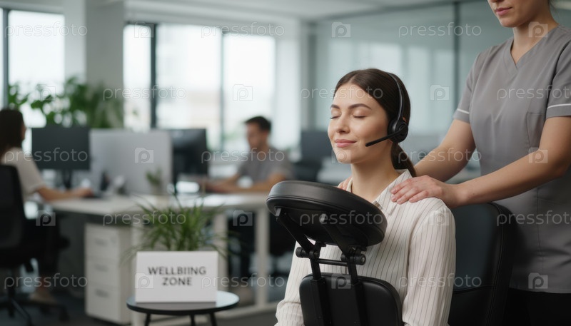 Офисный работник получает расслабляющий массаж в зоне благополучия на рабочем месте во время рабочего дня