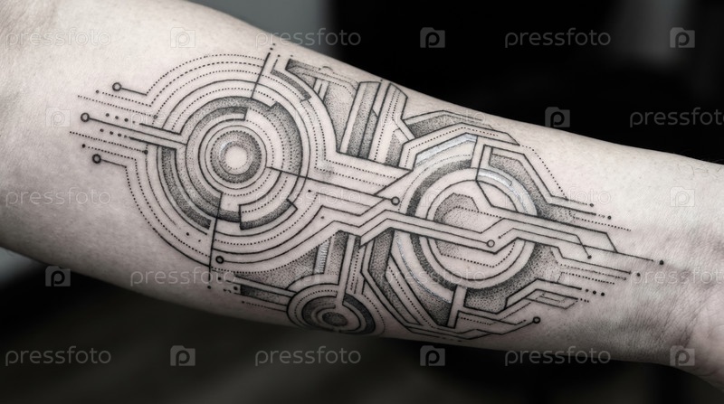 Геометрическая татуировка пятна на предплечье с футуристическим узором в стиле схемы, намекая на техническую идентичность современной цифровой культуры