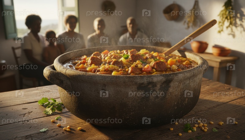 Большой семейный горшок для приготовления туши из смешанных бобов в сельском доме в Карибском регионе во время заката общего собрания
