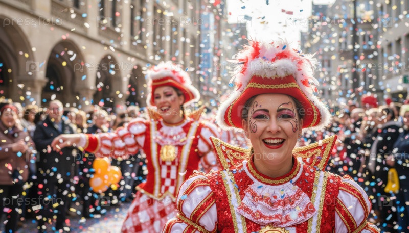 Красочные карнавальные исполнители танцуют в оживленном европейском уличном параде