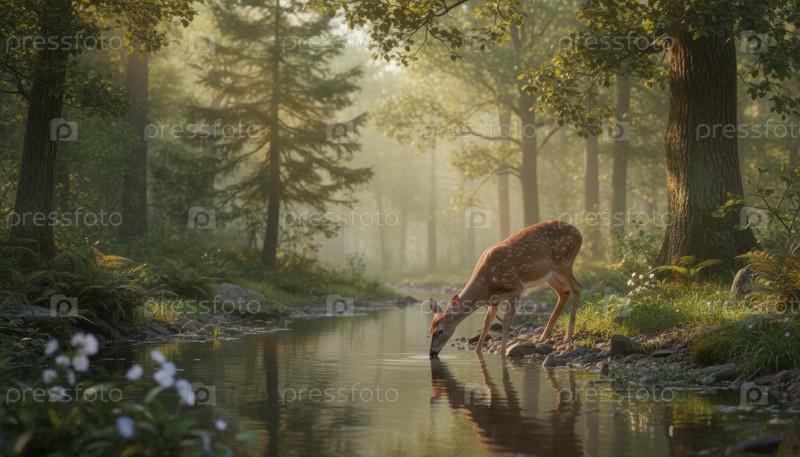 Спокойная лесная сцена с оленем, пьющим воду из ручья, иллюстрирующая чистоту природы, раннее утро, дикую природу, спокойствие и вдохновение для экологического путешествия