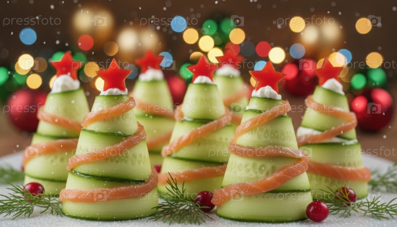 Творческая закуска в виде рождественской елки из огурцов, воплощающая праздничное кулинарное искусство и вдохновение для зимних вечеринок