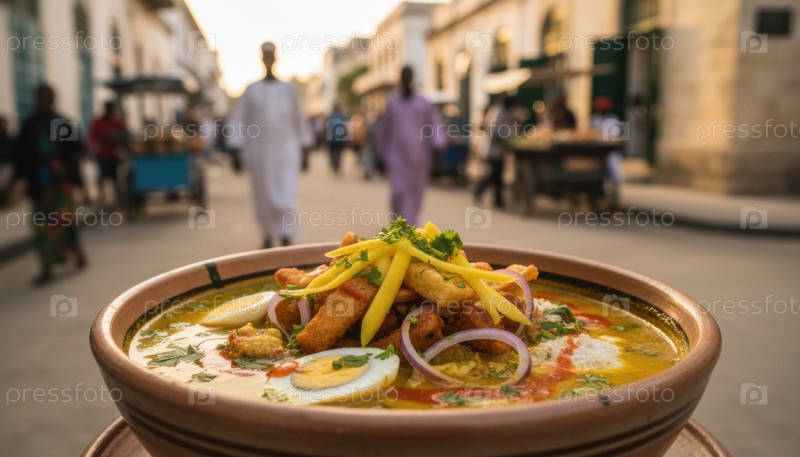 Ароматный западноафриканский суп с яйцами и жареной рыбой, подаваемый на оживленной улице в теплый вечер в регионе