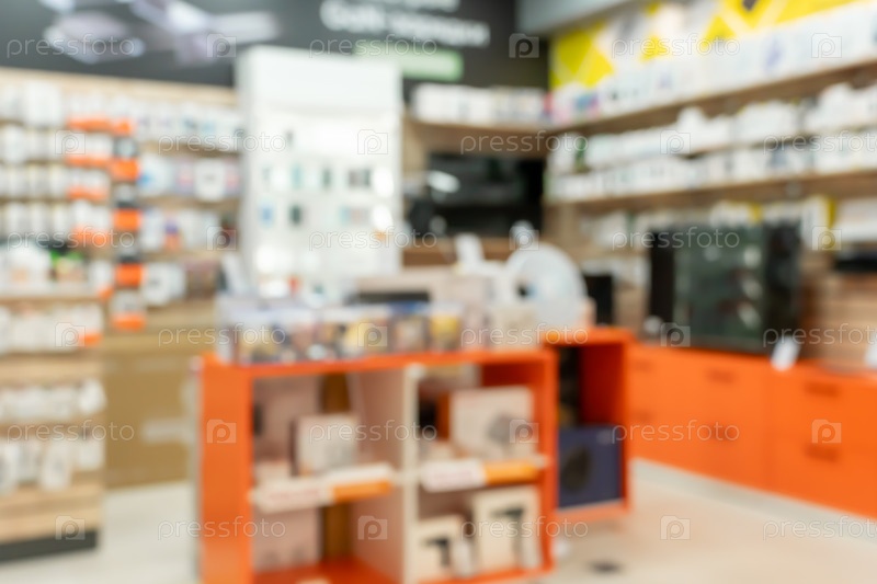 Размытый, яркий снимок интерьера магазина электроники с акцентом на современную торговую планировку и процесс покупок с эффектом боке идеально подходит для использования в качестве фона