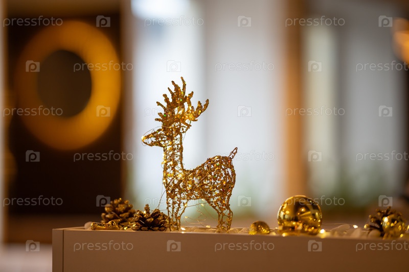Декоративная фигура оленя с золотыми ленточками станет центральным элементом праздничной рождественской композиции в комнате, украшенной эффектом боке, сосновыми конусами и создающей уютную праздничную атмосферу