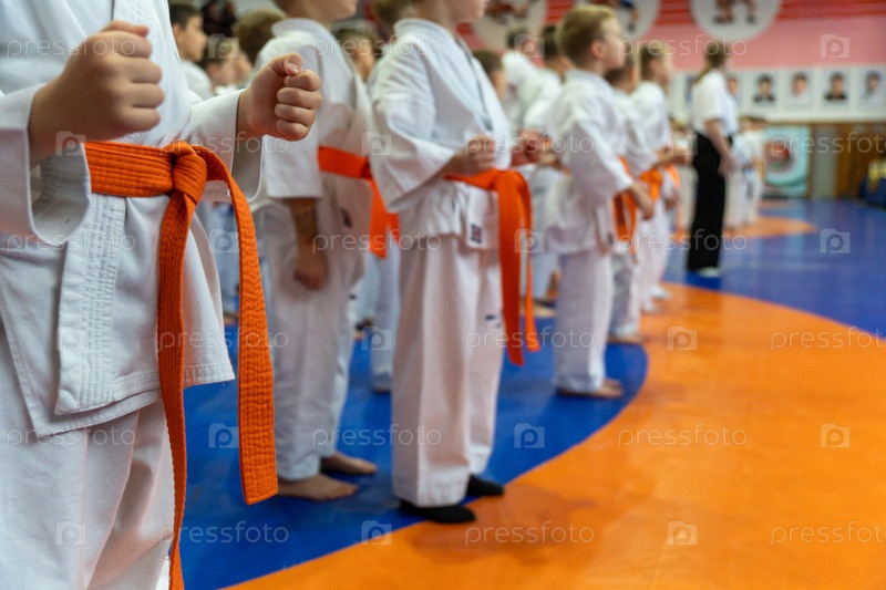 Близкий снимок с более низкого угла показывает группу детей в белых костюмах каратэ с оранжевыми поясами, стоящих в формировании во время сине-оранжевого занятия додзё