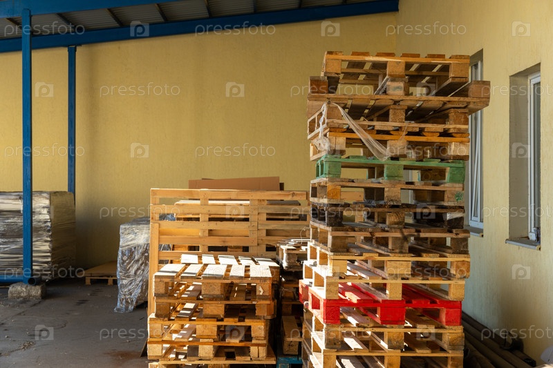 Стаки деревянных поддонов хранятся на промышленном складе, готовых к отгрузке, транспортировке, логистике, хранению и использованию в цепочке поставок