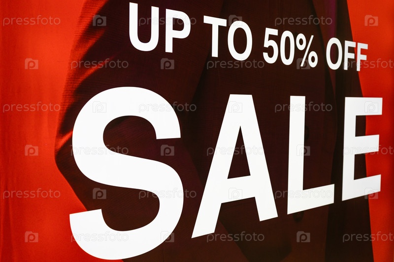 Близкий план ярко-красного знака магазина с белым текстом 'Продажа со скидкой до 50 процентов'