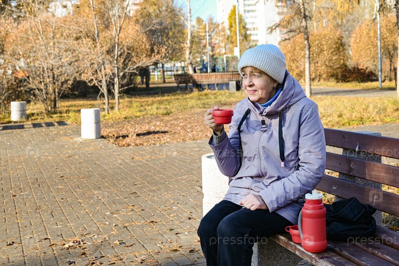 Старость, пенсия и концепция людей - близкие счастливые пожилые женщины в осеннем парке пьют кофе на вынос