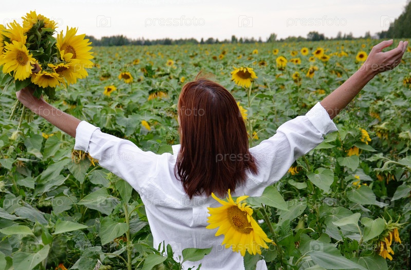 Женщина стоит в пышном поле, наполненном подсолнечками и радостно держит корзину с свежеприобретенными цветами под чистым голубым небом